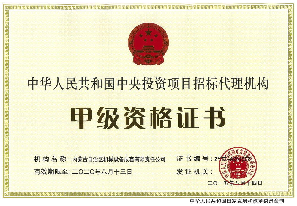 中央投資項目招標代理機構甲級資格證書